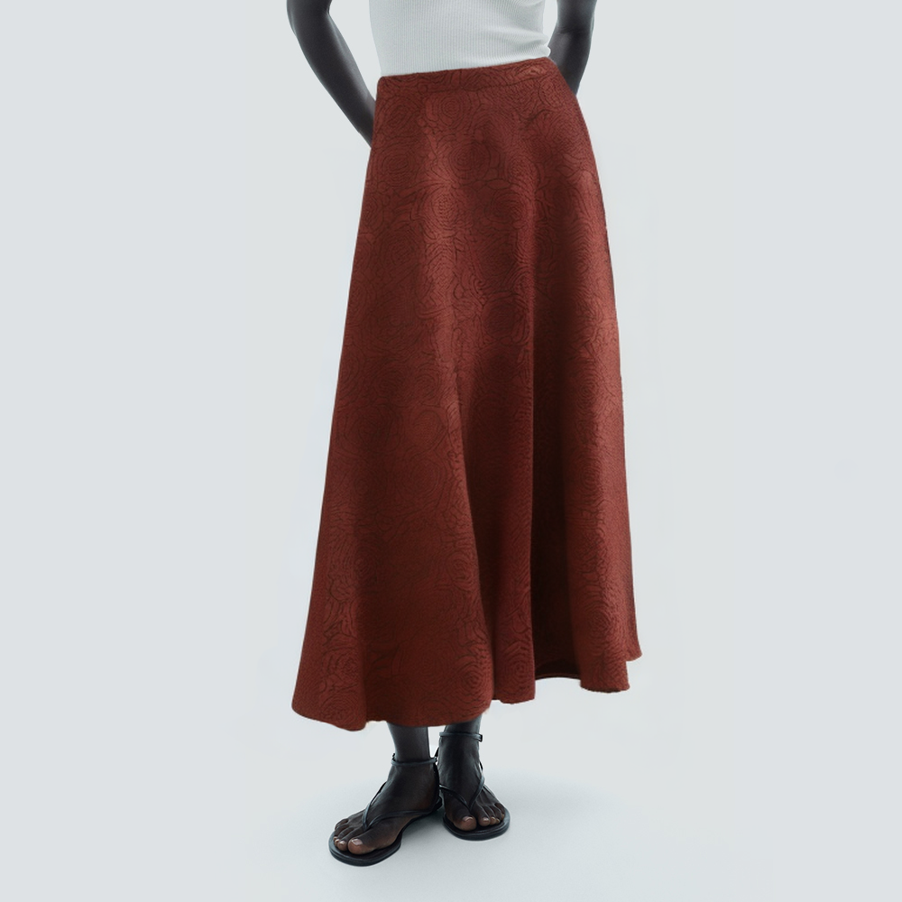 Description This long skirt is elegant and easy to pair with any top in a simple solid color. The A-line cut outlines the flowing hem and flatters the figure. The high waist design elongates the legs and highlights the wearer’s proportions, while the elastic waist ensures a comfortable fit. The zip fly makes it easy to put on and take…