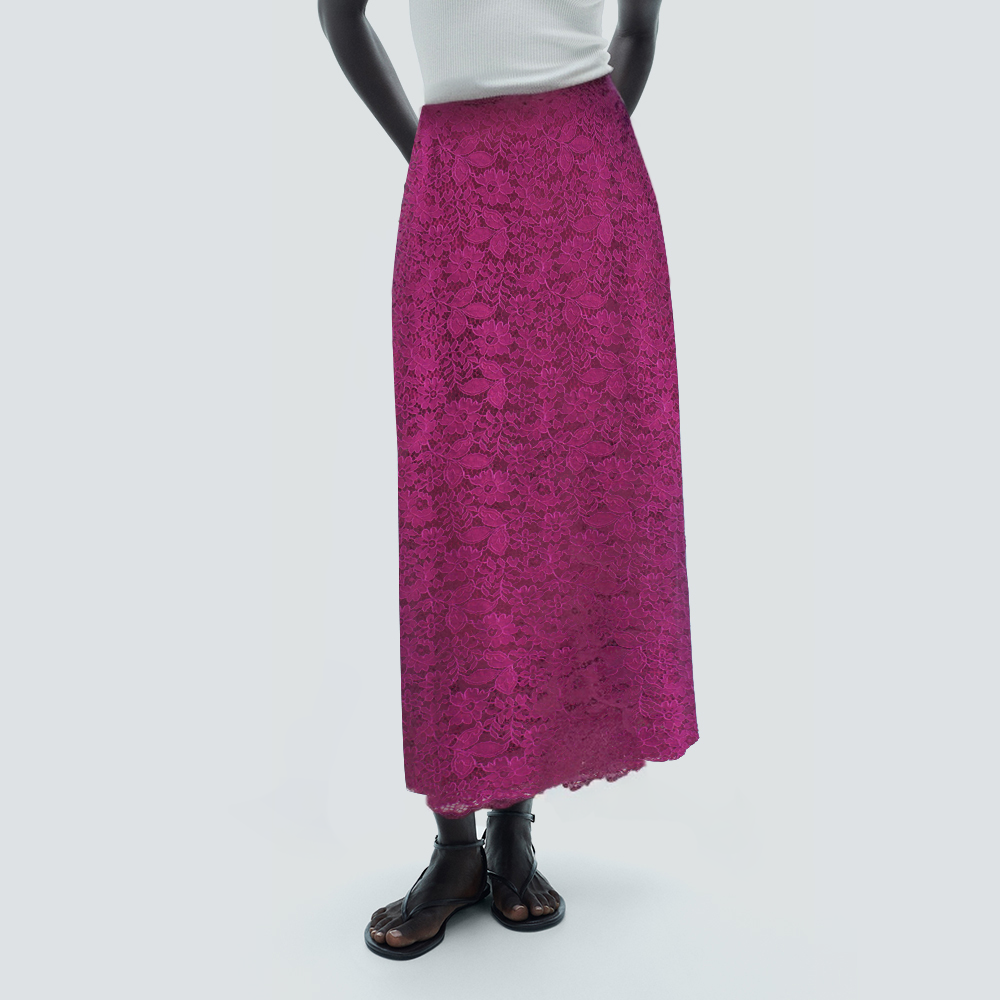 Description Feminine and sophisticated, this long skirt is crafted from beautiful lace. The A-line silhouette and pleated hem flatter the shape of your legs, creating an elegant, flowing silhouette. The mid-rise waist and side zipper make it easy to put on and take off, while ensuring a comfortable fit and a neat overall look. Product Features Lace Side zipper A-line…
