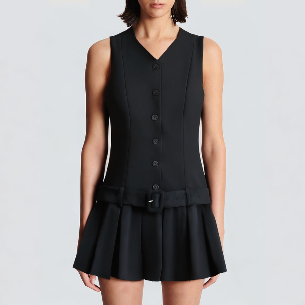 Description This short dress stands out with its simple and elegant design. The round neck and sleeveless design combine to show a refreshing and neat style, which is perfect for summer wear. The double-breasted details add a touch of retro elegance to the dress, and the front slit design adds a touch of sexiness and vitality, making the wearer exude…