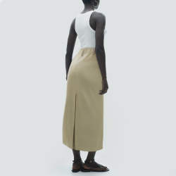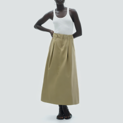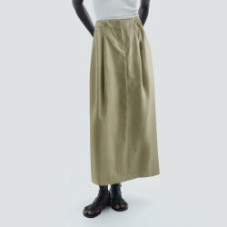 This long skirt features a simple solid color design with natural pleated details, creating a soft visual effect, showing unique elegance and femininity. The A-line skirt design can cleverly shape the body curves, providing a comfortable and flexible wearing experience. The patch pocket design on the sides not only adds practicality, but also makes the overall style more casual and modern.