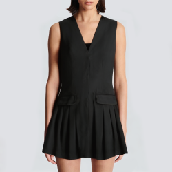 This short V-neck dress has a simple and chic design. The V-neck cut shows an elegant neck line, adding a feminine and gentle temperament. The side zipper design not only makes it easier to put on and take off, but also maintains the smooth lines of the skirt. The sleeveless style is suitable for warm seasons, making it more comfortable and refreshing to wear. The pleated design of the skirt brings a sense of movement and layering, and it swings naturally with the steps, adding a smart atmosphere.